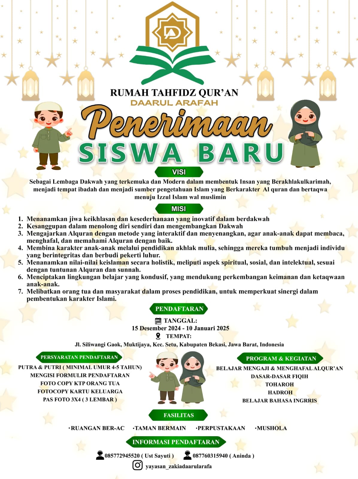 Yayasan Daarul Arafah merupakan lembaga pendidikan dan dakwah yang berfokus pada pembinaan generasi Qur’ani yang cerdas, berakhlak mulia, dan berwawasan luas. Berdiri atas kepedulian terhadap pentingnya pendidikan Al-Qur’an sejak dini, yayasan ini menyelenggarakan program tahfidzul Qur’an, pendidikan formal dan non-formal, serta berbagai kegiatan keagamaan untuk membentuk pribadi yang mencintai Al-Qur’an dan mampu menjadi agen kebaikan di tengah masyarakat. Yayasan Daarul Arafah juga terbuka bagi siapa pun yang ingin berkontribusi.